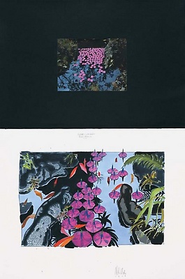 Terre, eau, branche de noisetier, jacinthes des bois, feuilles mortes. Vallery, Yonne, France, 2000